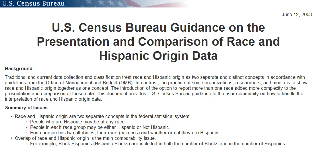 The U.S. Census’ “Guidance on the Presentation and Comparison of Race and Hispanic” states the following: