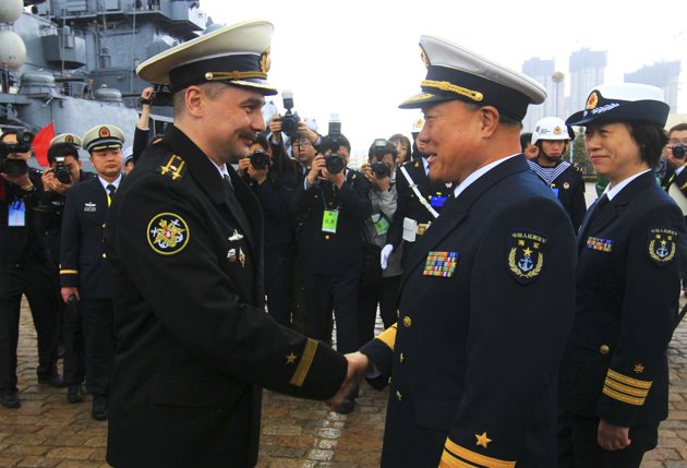 In this photo released by China’s Xinhua News Agency, Rear Adm. Du Xiping, front right, deputy commander of China’s Beihai Fleet, shakes hands with Captain First Rank Sergei Yuriyevich Zhuga of Russia’s Pacific Fleet during a welcome ceremony at a naval base in Qingdao, east China’s Shandong Province, Saturday, April 21, 2012. A China-Russia joint maritime drill is scheduled from April 22 to 27 on the Yellow Sea, Xinhua said. (AP Photo/Xinhua, Zha Chunming)