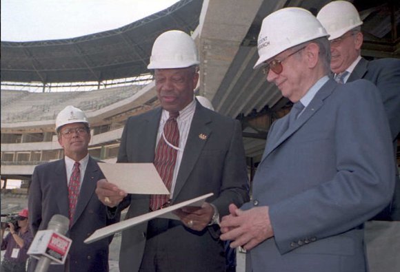 US Olympic Committee President LeRoy Walker presents International Olympic Committee President Juan Antonio Samaranch (R) with the official RSVP card for the US Olympic Team while on a tour of the Olympic Stadium as Atlanta Committee for the Olympic Games President Billy Payne, left, looks on September 17, 1995, in Atlanta. DOUG COLLIER – AFP/Getty Images