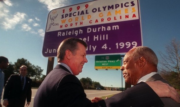 NC Department of Transportation Secretary E. Norris Tolson, left, congratulates Special Olympics President, LeRoy Walker, right, after the last of the new Special Olympic roadsigns were unveiled at the RDU Airport in 1999. –Corey Lowenstein- News & Observer