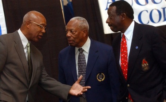 Olympic medalist John Carlos, President Emeritus of the U.S. Olympic Committee Dr. Leroy T. Walker, and St. Augustine’s College Track and Field coach George Williams. Williams, who also resides in Raleigh-Durham, was mentored by Dr. Walker and followed in Walker’s footsteps by building a dynasty in track and field and cross country at a university, this time it was at Saint Augustine’s University. Williams coached 32 Olympians, including 3 who won gold. Williams served as assistant coach of the 1996 U.S. Olympic Track and Field Team in Atlanta and was the head coach of the 2004 Men’s Olympic Track and Field Team in Athens, Greece. –2004 NEWS & OBSERVER FILE PHOTO