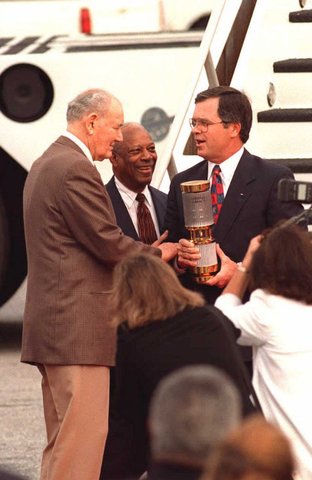 William Porter Payne, right, president of the Atlanta Committee for the Olympic Games, arrives in Los Angeles in April from Athens, Greece, carrying the Olympic flame in a safety lantern. Los Angeles City Councilman John Ferrarro, left, and Dr. LeRoy Walker, center, head of the US Olympic Committee, greet him.HAL GARB – AFP/Getty Images