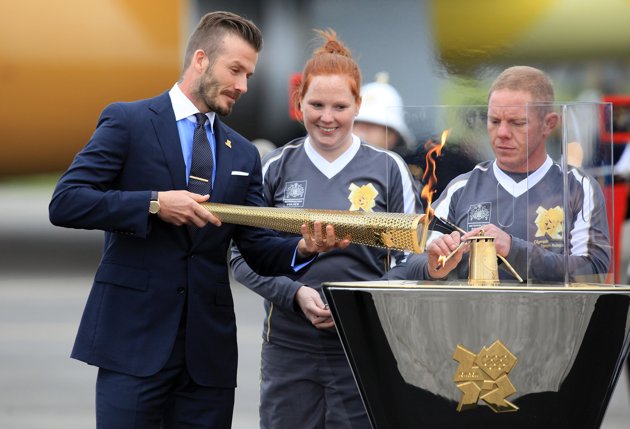 David Beckham lights the Olympic Flame as it arrives at RNAS Culdrose near Helston on May 18, 2012 in Cornwall, England. The Olympic Flame arrived in the UK after it was handed over at a ceremony yesterday in Athens. A British delegation including David Beckham, flew back with the flame from Greece where they attended a ceremony welcoming the flame, before it is taken on a 70-day relay involving 8,000 torchbearers covering 8,000 miles. (Photo by Matt Cardy/Getty Images)