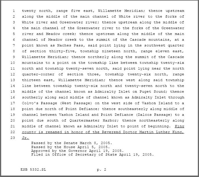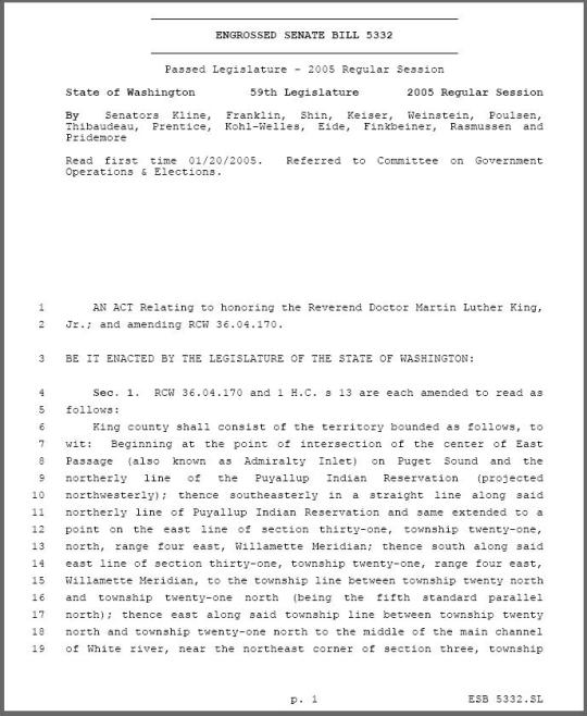 On February 24, 1986, the King County Council passed Council Motion 6461 5 votes to 4 setting forth the historical basis for the renaming of King County in honor of Martin Luther King, Jr. Because only the state can charter counties, this change was not made official until April 19, 2005, when Washington Governor Christine Gregoire signed Senate Bill 5332 into law.