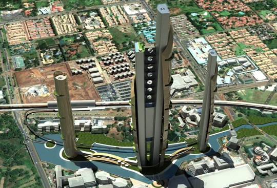 The planned Centurion Symbio-City development will comprise two office buildings and one residential tower. The tallest tower will be 447 metres high, reaching 110 storeys. It will be flanked by two towers of 80 and 60 floors.