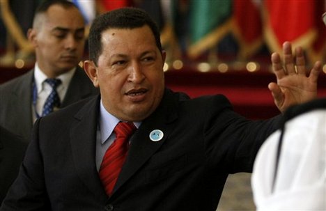 Chavez wore a track suit in the yellow, blue and red of Venezuela’s flag as he rode through streets lined with supporters on his way to the elections office. Confetti floated in the air as he passed. Some in the crowd waved flags, and others blew whistles and horns.