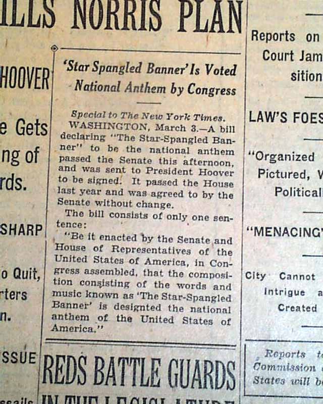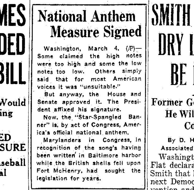 Today, it might seem shocking what was not the major news story on March 4, 1931 or on March 5, 1931 and that was “The Star Spangled Banner”. Many American newspapers published articles announcing that the country now had an official National Anthem. But, these articles were not the main headliners, nor were they the secondary headliners. In many cases the announcements, that the United States now had an official national anthem, were published in small areas of the nations daily newspapers.