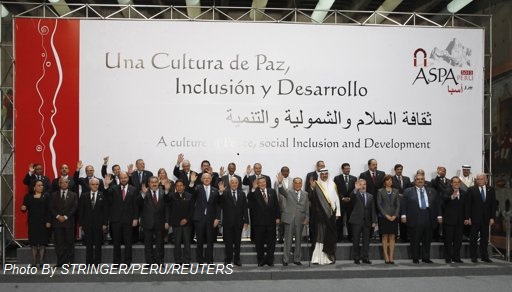 Foreign Affairs Ministers of South American and Arab states pose for group picture in Lima, October 1, 2012. The ministers are in Peru to attend a summit of leaders from South American and Arab states.