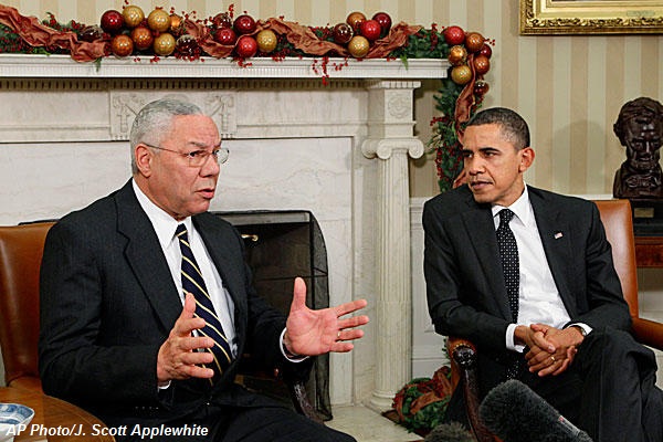 Former Secretary of State Colin Powell meets with President Barack Obama in the Oval Office in Washington in 2010.