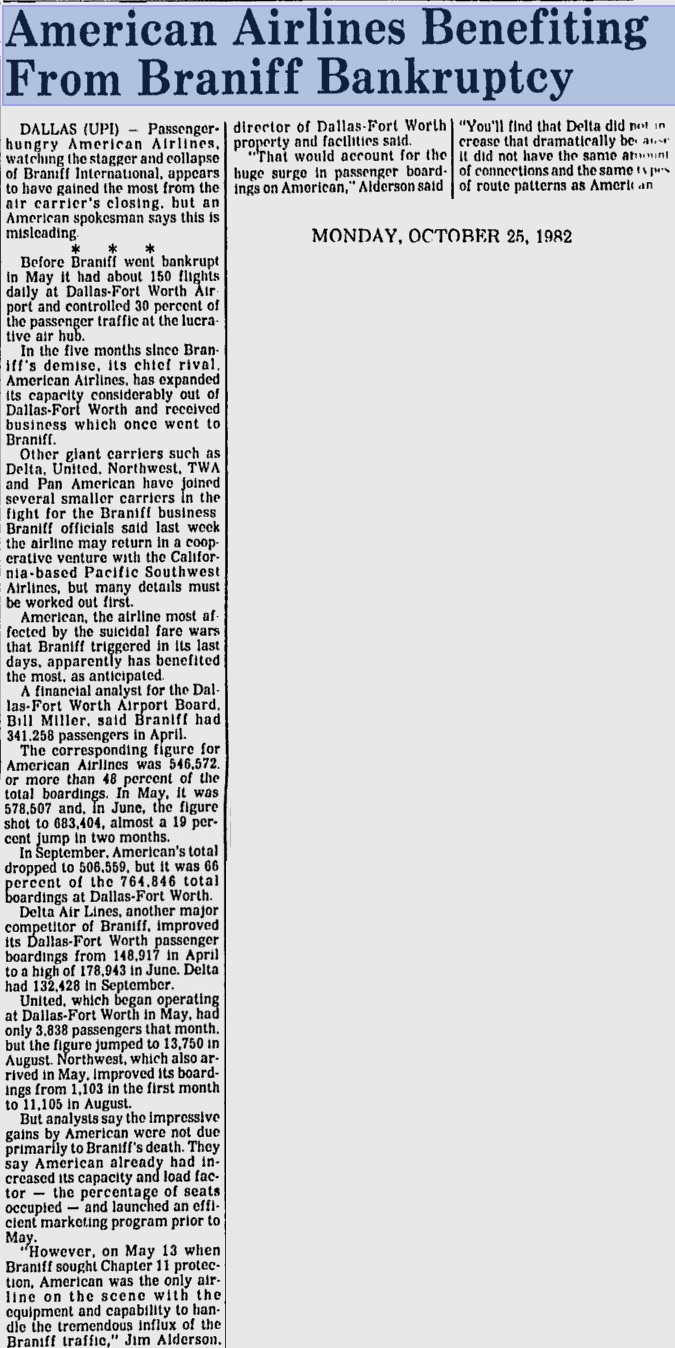 Braniff the nation’s 8th-largest airline, ceased operations on May 12, and filed for Chapter 11 reorganization in Federal Bankruptcy Court in Fort Worth early the next day.
