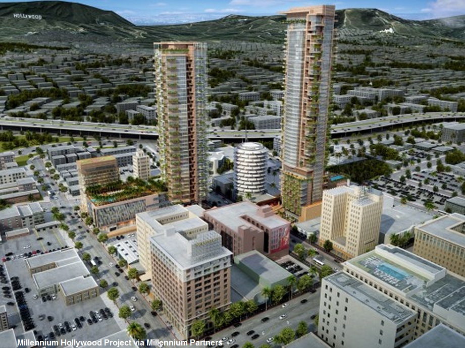 The Hollywood site has a restriction of the total ratio of square footage to land of 4.5 to 1. The ratio can be increased to 6 to 1 with city approval, allowing 1.17 million square feet of floor area. That change is being considered today by the planning commission. Millennium also is seeking permission to reduce the number of parking spaces, hold outdoor events and serve alcohol.