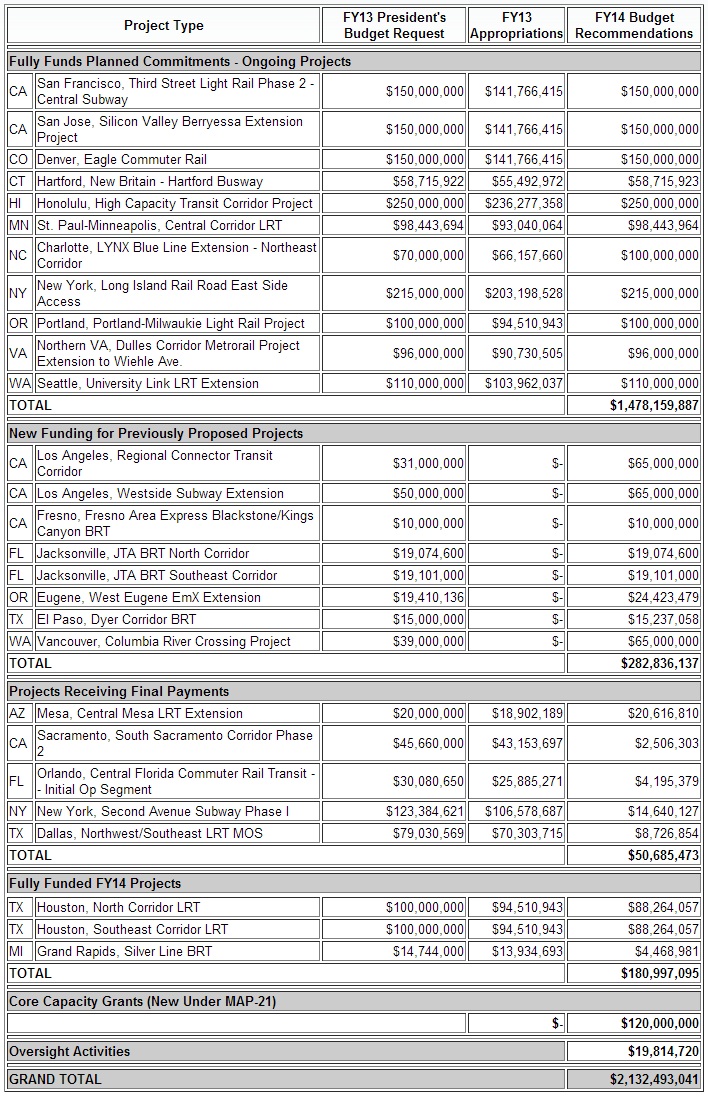 Summary of Funding for Capital Investment Grant Program: Fiscal Years 2013 and 2014