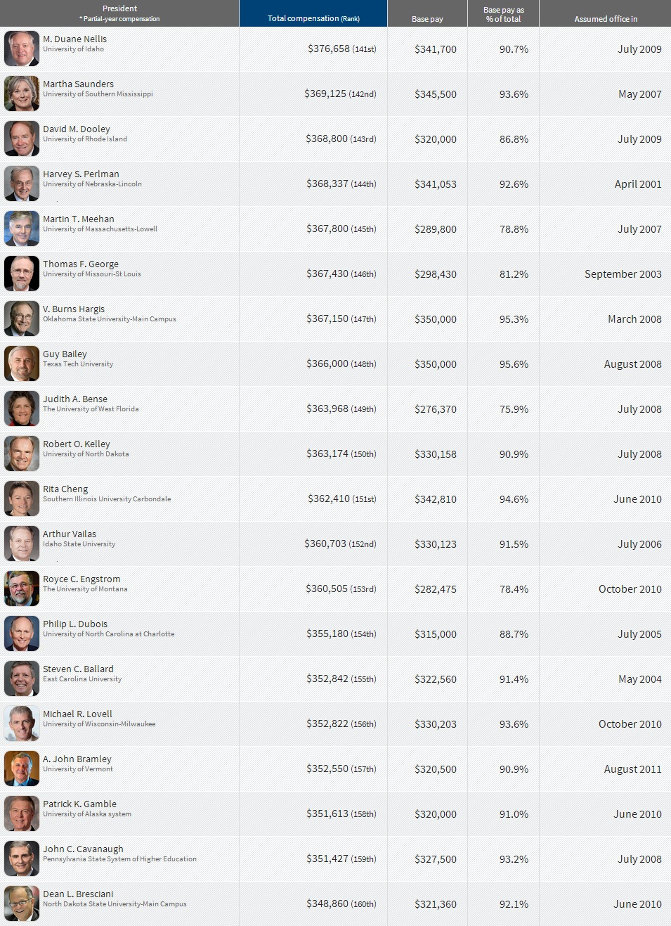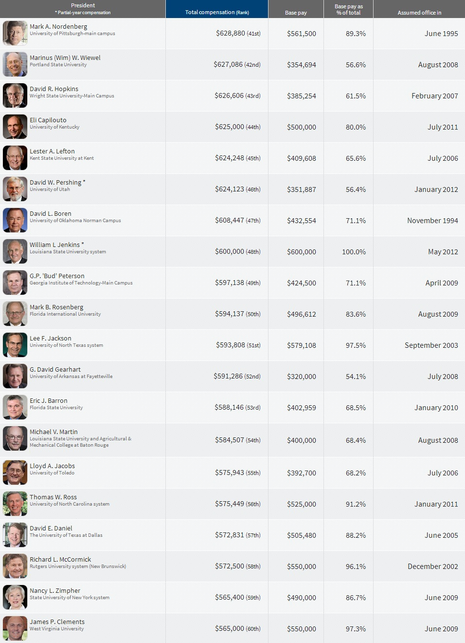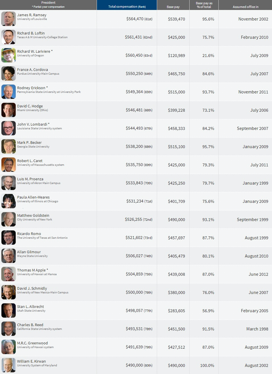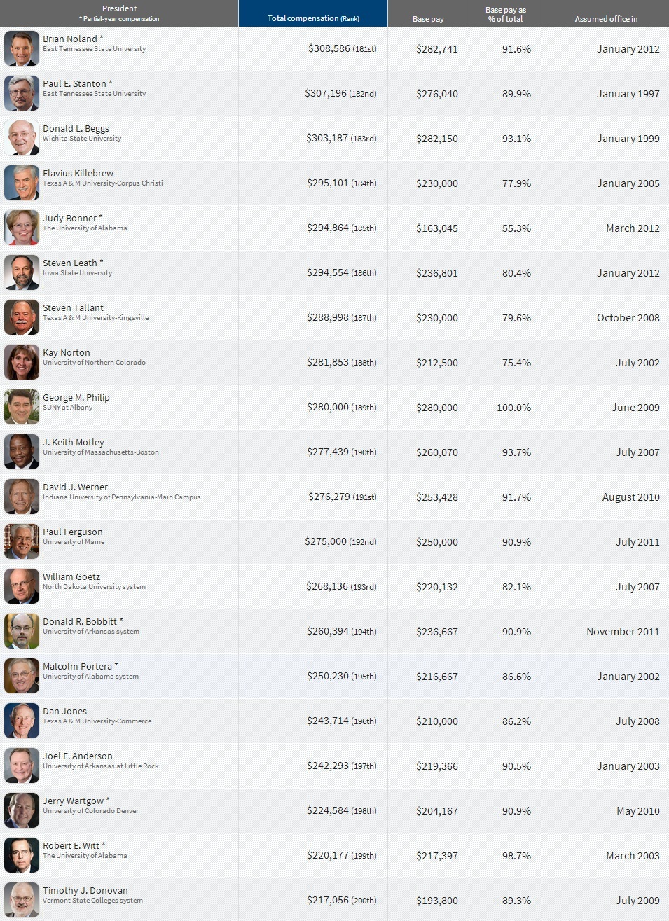 Compensation received in the 2012 fiscal year by 200 chief executives at public universities and systems in the United States. Fiscal years typically run from July 1 to June 30 but can vary by institution.