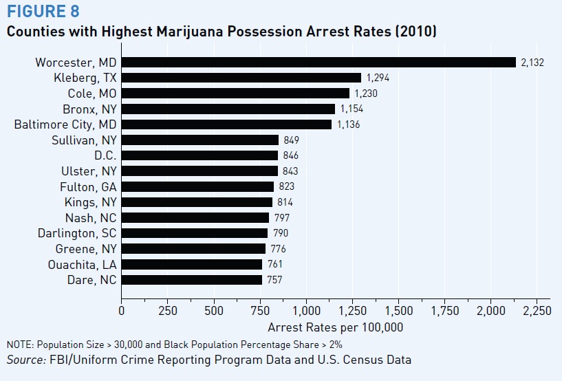 Such racial disparities in marijuana possession arrests exist in all regions of the country, in counties large and small, urban and rural, wealthy and poor, and with large and small Black populations. Indeed, in over 96% of counties with more than 30,000 people in which at least 2% of the residents are Black, Blacks are arrested at higher rates than whites for marijuana possession.