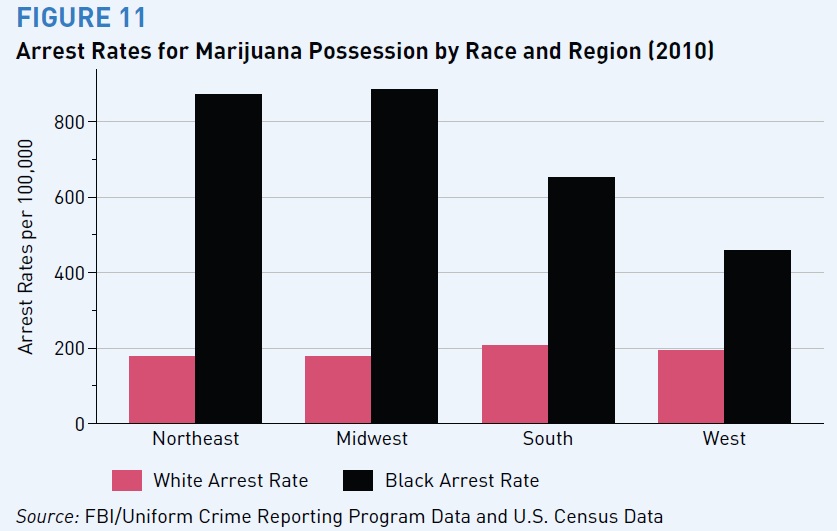 The report also finds that, on average, a Black person is 3.73 times more likely to be arrested for marijuana possession than a white person, even though Blacks and whites use marijuana at similar rates.
