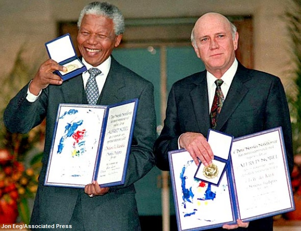 Dec. 10, 1993 Mandela shares the Nobel Peace Prize with South African President Frederik W. de Klerk for their joint leadership of a negotiated transfer of power from the white minority to the black majority.