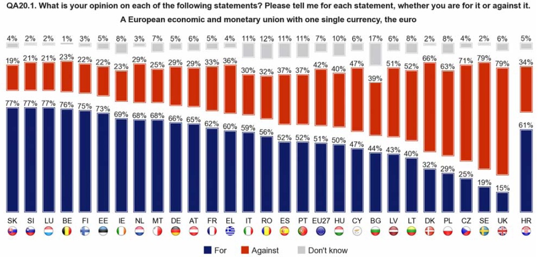 An absolute majority (51%) of Europeans are in favour of the euro, with those living within the Euro area supporting the single currency with a two-thirds majority (62%). This support is at or near its strongest (between 68% and 77%) in four out of the last five countries to join the Euro area (Estonia, Malta, Slovenia and Slovakia).