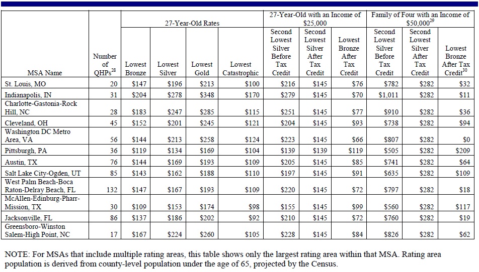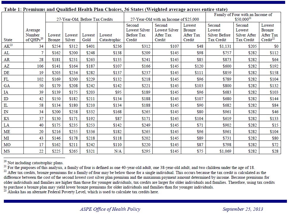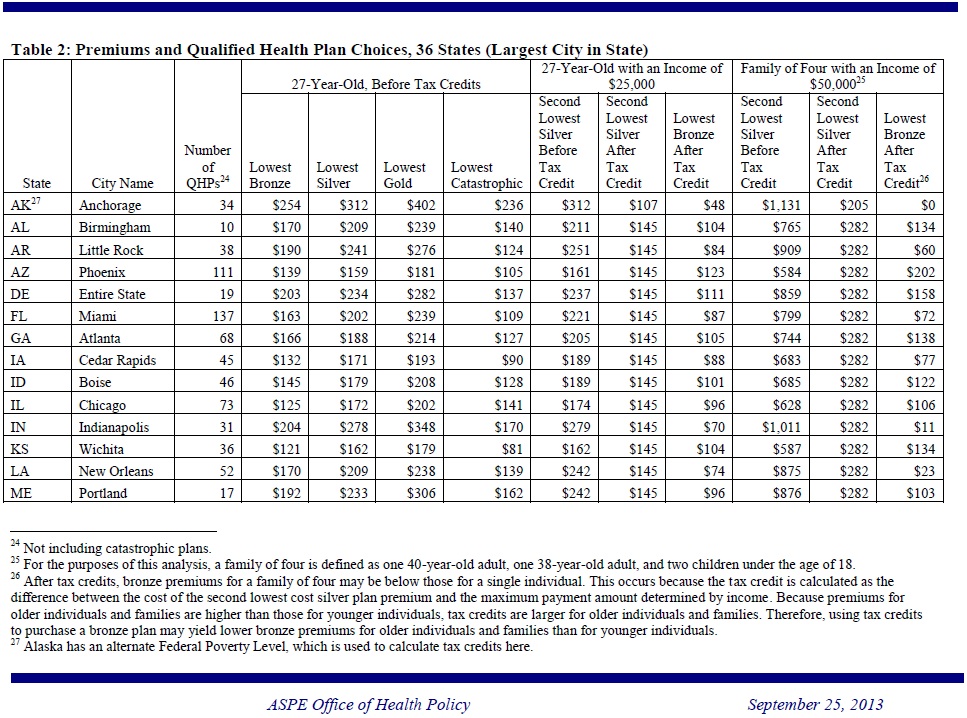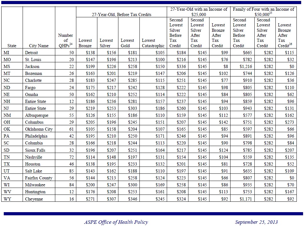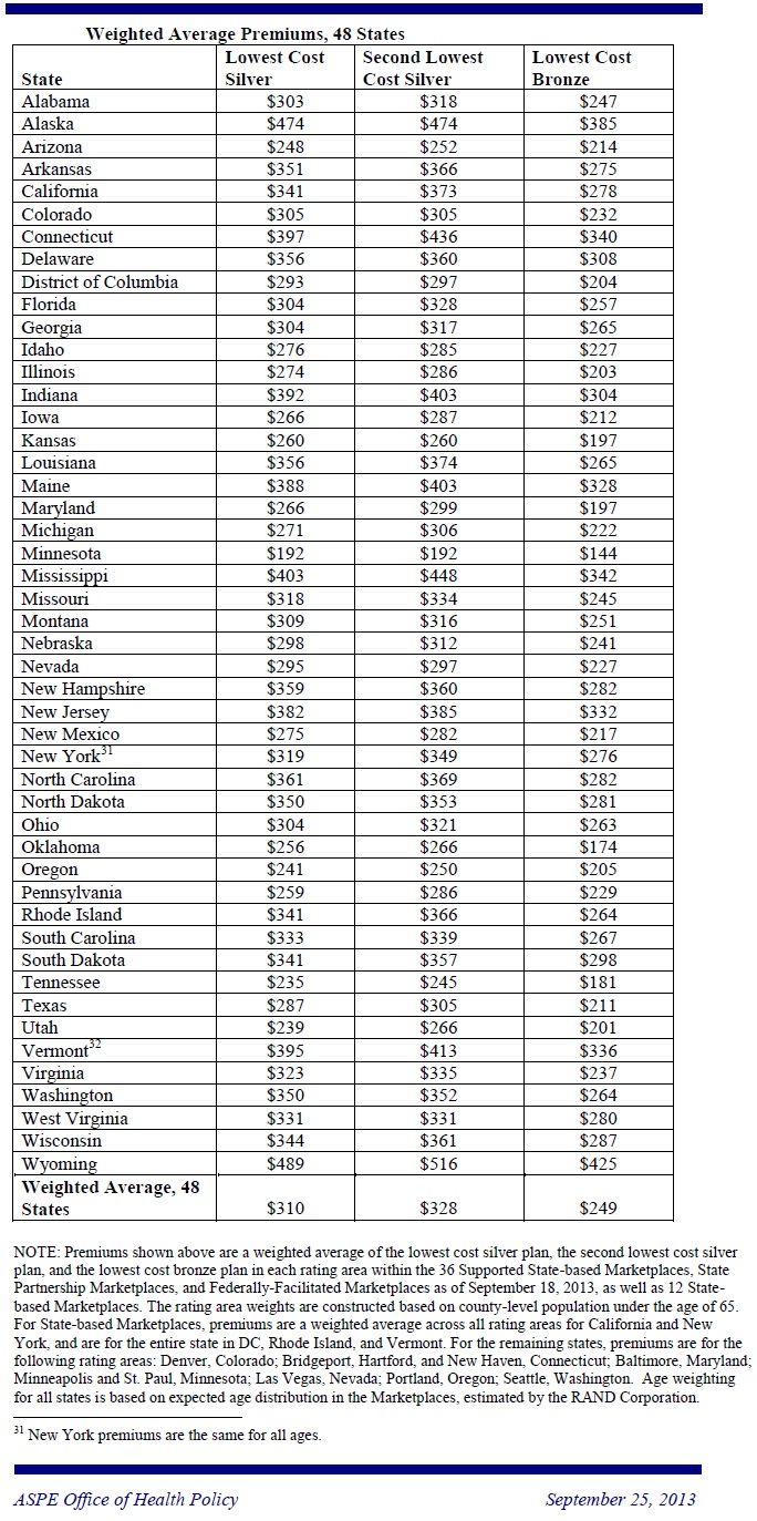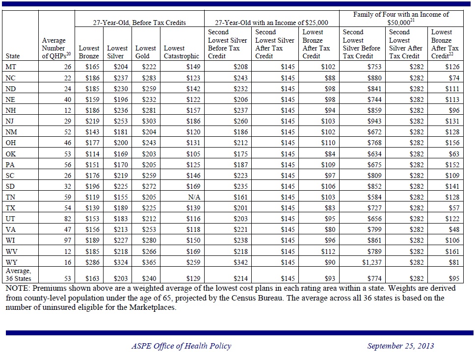 The report, released by the Department of Health and Human Services (HHS) finds that in state after state, affordable options will be available through the Health Insurance Marketplace in 2014. Nearly all eligible uninsured Americans (about 95%) live in states with average premiums below earlier projections. And nearly all consumers (about 95%) will have a choice of health insurance companies,each of which offers a number of different plans.