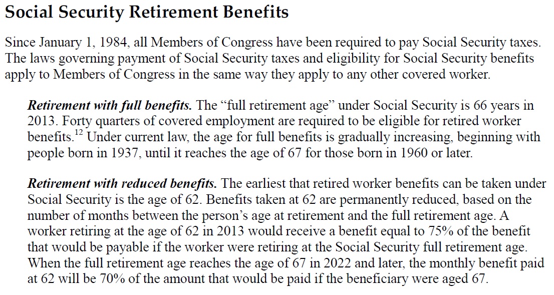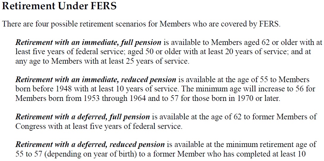 Under both CSRS and FERS, Members of Congress are eligible for a pension at the age of 62 if they have completed at least five years of service. Members are eligible for a pension at age 50 if they have completed 20 years of service, or at any age after completing 25 years of service.