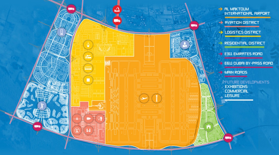 The integrated master plan of Dubai World Central is comprised of eight districts: logistics, aviation, Al Maktoum International Airport, humanitarian, residential, commercial, leisure, exhibition and commercial. The centerpiece of the master plan is the Al Maktoum International Airport, which has the first of five planned runways completed and in operation. Around it, industry-focused districts take advantage of their close proximity to the airport to add unique facets to their value propositions. The logistics, humanitarian and aviation districts enjoy the added benefits of airside access while the exhibition district offers efficiency and cost savings due to its close proximity to the airport. Residential, commercial and leisure districts provide accommodation, office and entertainment options for people working at DWC and businesses that require frequent travel.