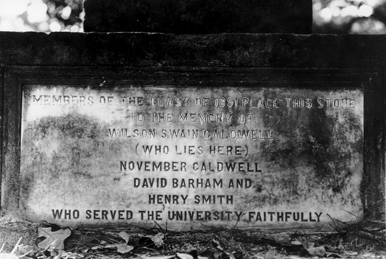 After the Class of 1891 arranged to have the old Caldwell Monument placed over the grave of Wilson Caldwell, they placed a marble stone at its base with the inscription seen here. The inscription pays tribute not only to Wilson Caldwell but to longtime college servants November Caldwell (Wilson’s father), David Barham, and Henry Smith. Image from the North Carolina Collection Photographic Archives.