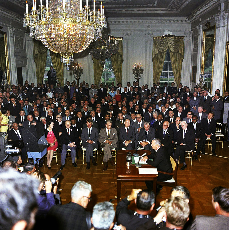 President Johnson speaks to a nationwide television audience from the White House just before signing the Civil Rights Act of 1964. Among those in the front row are Lady Bird Johnson, Attorney General Robert F. Kennedy, Senator Everett Dirksen, Senator Hubert Humphrey, House Minority Leader Charles Halleck, Representative Emanuel Celler, and House Speaker John McCormack. The second row includes FBI Director J. Edgar Hoover, civil rights leaders Whitney Young and Martin Luther King, Jr., and labor leader George Meany. (LBJ Library)