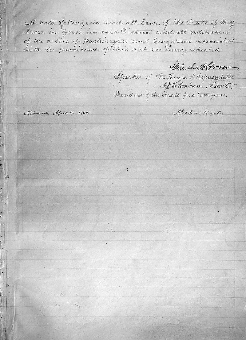 On April 16, 1862, President Abraham Lincoln signed a bill ending slavery in the District of Columbia.