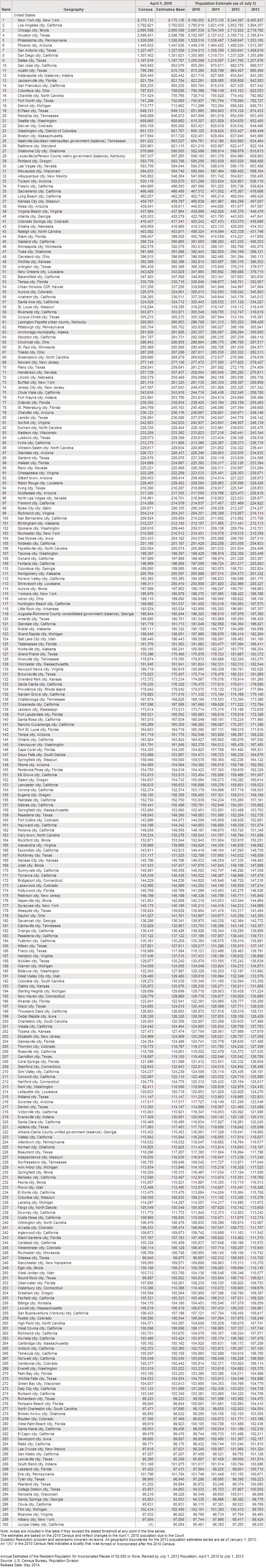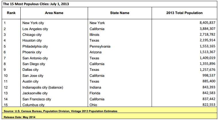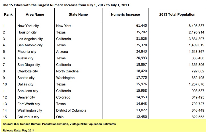 The nation’s largest city, New York, added 61,440 people in the year ending July 1, 2013. New York continued to be the nation’s most populous city by a wide margin, with 8.4 million residents in 2013, followed by Los Angeles and Chicago.
