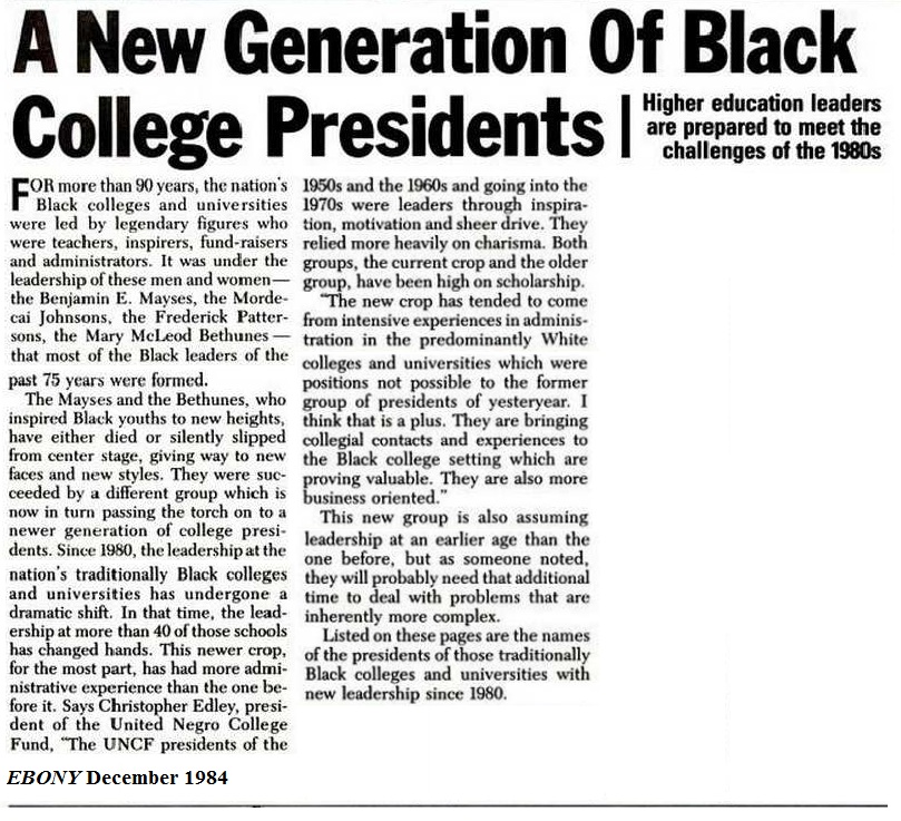 Many of the presidents who took office in the 1980s are now retiring. This excerpt is from an EBONY magazine article dated December 1984. This was a time when Baby Boomers were becoming college and university presidents.