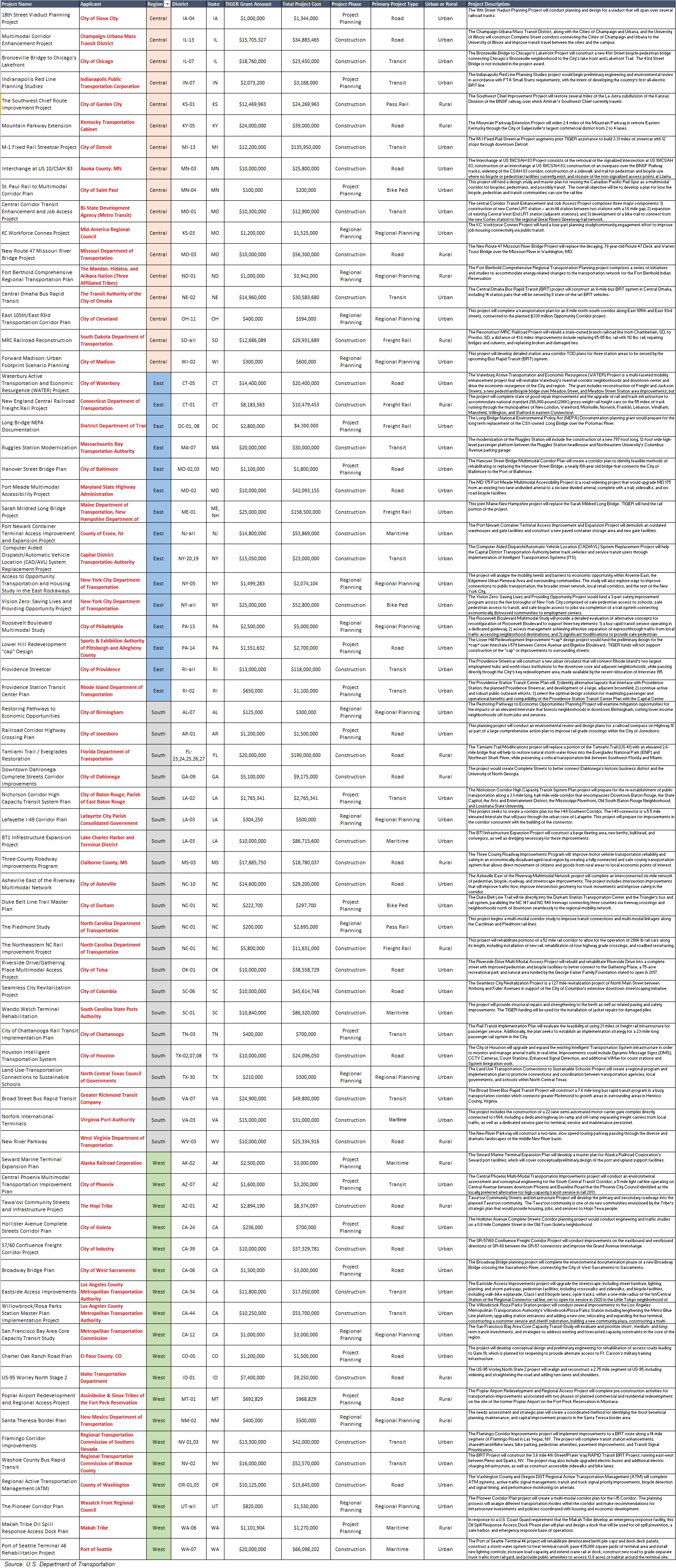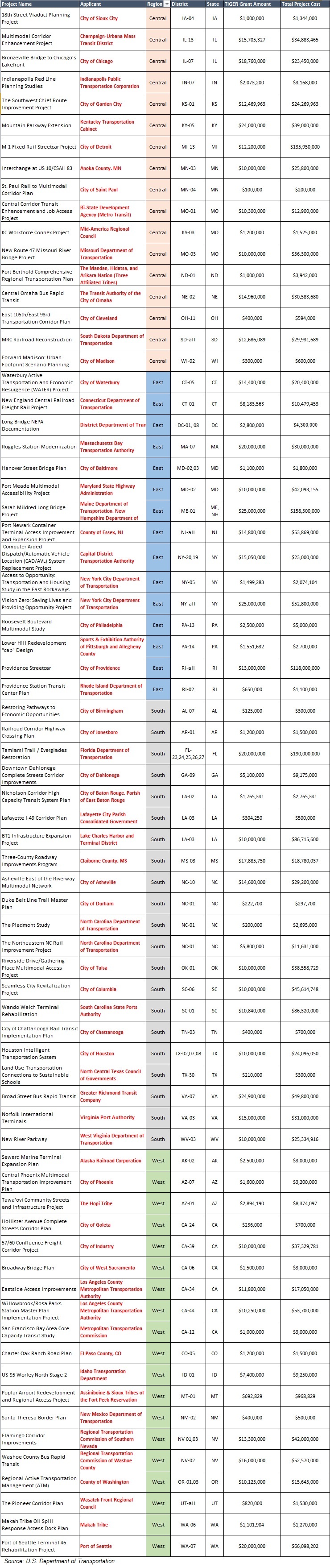 “As uncertainty about the future of long-term federal funding continues, this round of TIGER will be a shot in the arm for these innovative, job-creating and quality of life-enhancing projects,” said Secretary Foxx. “We’re building bridges from Maine to Mississippi. We’re creating ladders of opportunity for the middle-class and those seeking to enter the middle-class by investing in transit, road and rail projects from Los Angeles to Detroit to New York City, increasing access to jobs and quality of life. For every project we select, however, we must turn dozens more away – projects that could be getting done if Congress passed the GROW AMERICA Act, which would double the funding available for TIGER and growing the number of projects we could support.”
