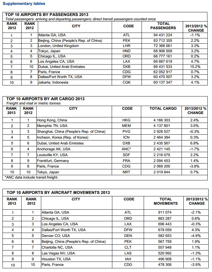 Atlanta (ATL) remains the busiest airport on the globe with 94.4 million passengers in 2013. Although traffic at the airport was down 1.1% over 2012, the second ranked Beijing (PEK), with 83.7 million passengers, experienced more subdued growth of 2.2% in 2013 as compared to the double-digit growth it achieved in previous years.