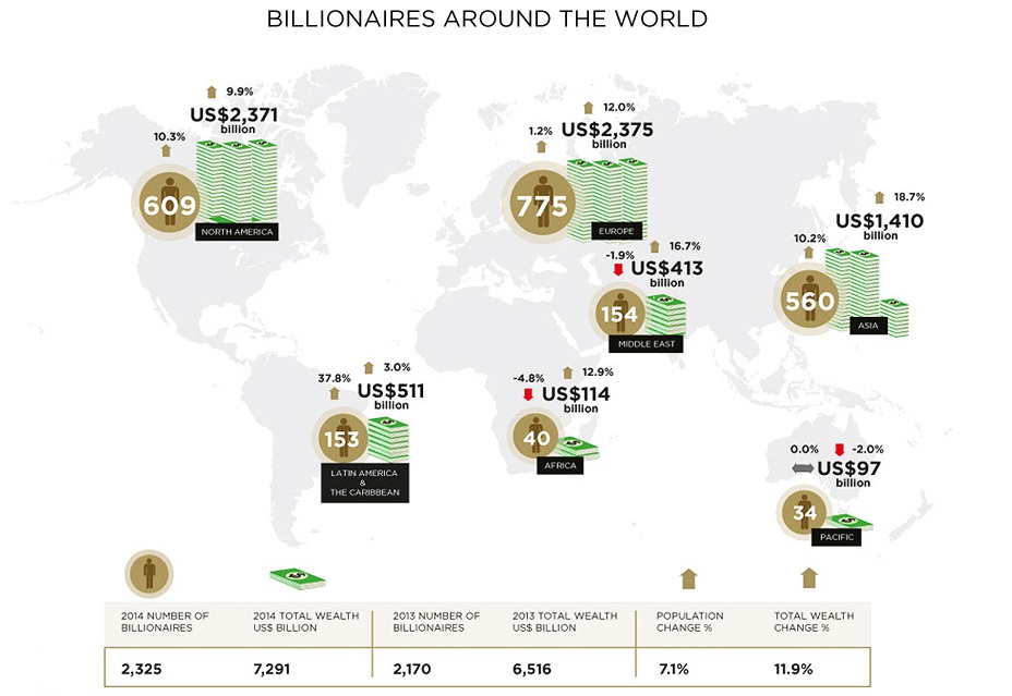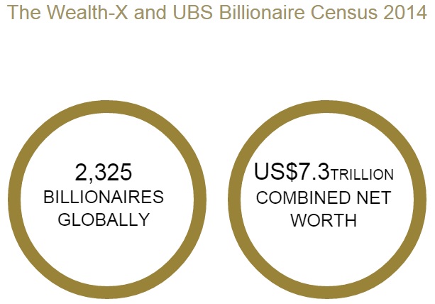The Wealth-X and UBS Billionaire Census 2014 shows that the global billionaire population reached an all-time record high of 2,325 billionaires in 2014 with a combined net worth of US$7.3 trillion.