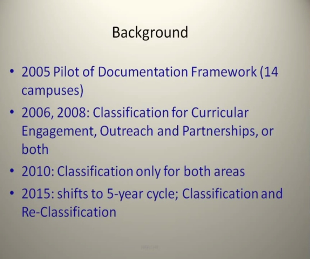 The Carnegie Community Engagement Classification, which is a voluntary classification in that institutions apply to be included, that is housed at the New England Resource Center for Higher Education, will continue to be administered by that organization.