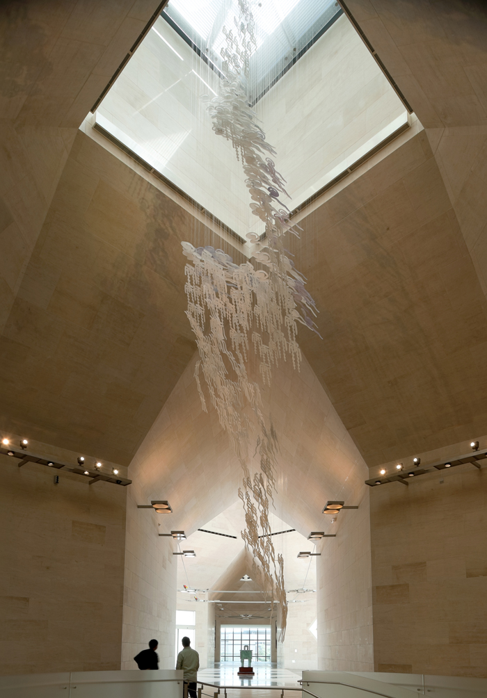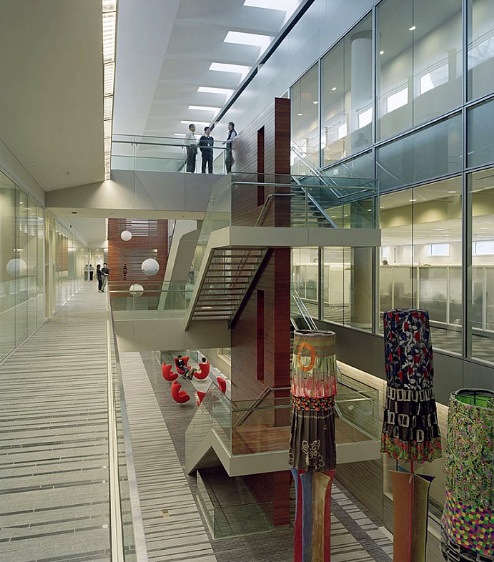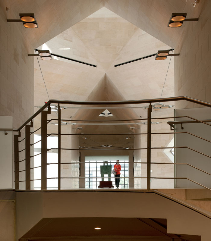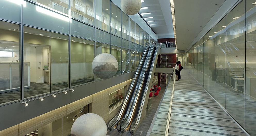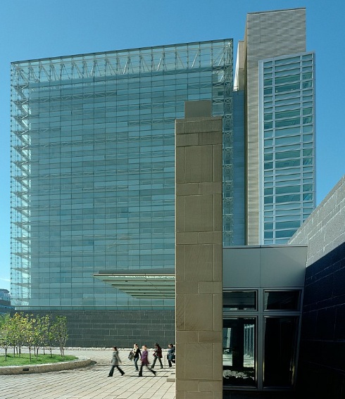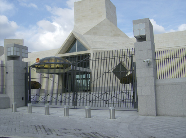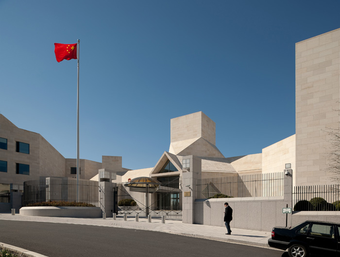 The U.S. Embassy complex in Beijing is the second-largest embassy compound ever built by the federal government. Eight buildings make up the 9.88 acre (4-hectare) site, including a consular services building, marine barracks, and perimeter inspection stations. The centerpiece of the complex is a gleaming, eight-story glass box whose curtain wall shifts between transparent, translucent, and opaque glass panels. At night, the illuminated office building calls to mind a traditional paper lantern. Designed by Skidmore, Owings & Merrill LLP (SOM).