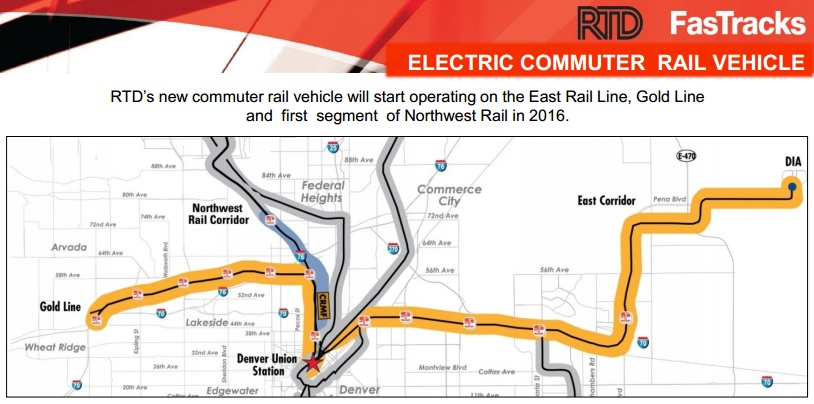 The East Commuter Rail Line between Denver’s Union Station and the Denver International Airport remains on schedule to open in 2016. The first four commuter cars that will travel the line have arrived in Colorado and are parked at Union Station in preparation for public tours.
