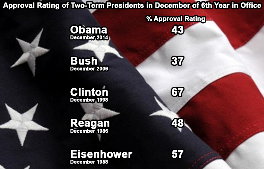 Of course, there are remarkably few presidents since the advent of modern polling who actually were elected to two terms and served through to the end of their sixth year in office, where Obama is now. In other words, there aren’t a lot of presidents with whom to compare Obama at this point in his administration — only Dwight Eisenhower, Ronald Reagan, Bill Clinton and George W. Bush.