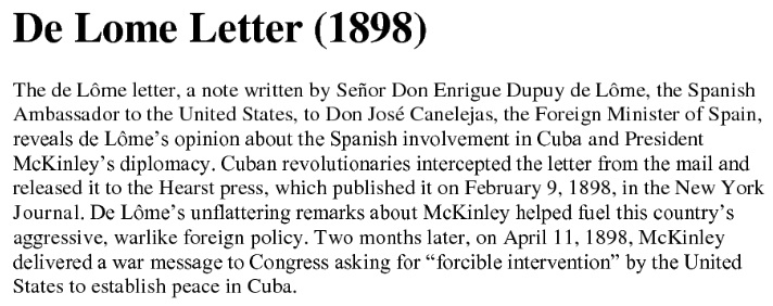 Enrique Dupuy de Lôme, the Spanish ambassador to the United States, defamed U.S. President William McKinley and attacked McKinley’s policies in what is known as the De Lôme Letter. Cuban rebels intercepted the letter, and on February 9, 1898, the letter was published in U.S. newspapers. This helped contribute to the Spanish-American War which started April 25, 1898 and ended August 12, 1898.