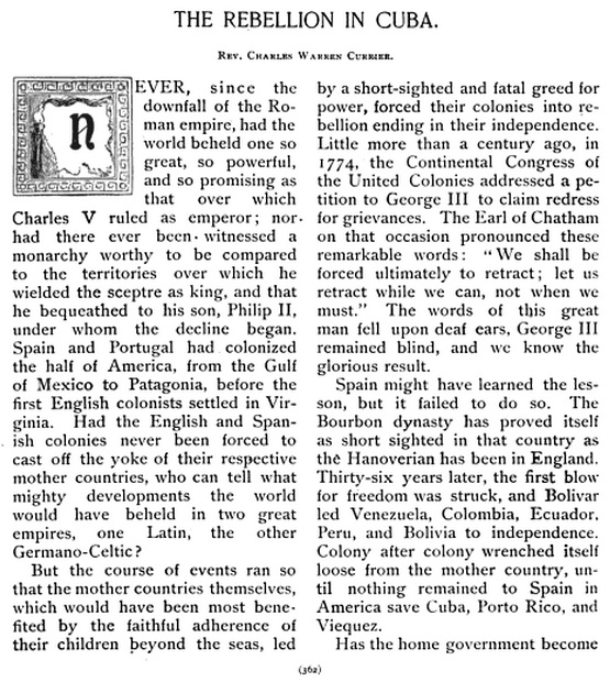 After Winston Churchill returned to England, after his expedition to Cuba, he wrote three pieces on Cuba for the Saturday Review, “The Revolt in Cuba,” and “The Intervention in Cuba” and (again) “The Revolt in Cuba,” published on February 15, March 7 and August 29, 1896.