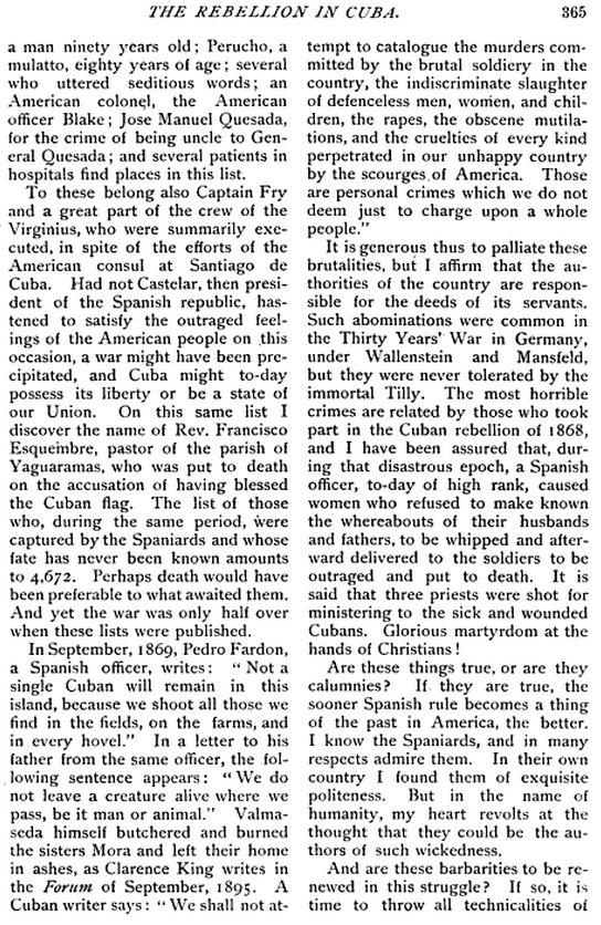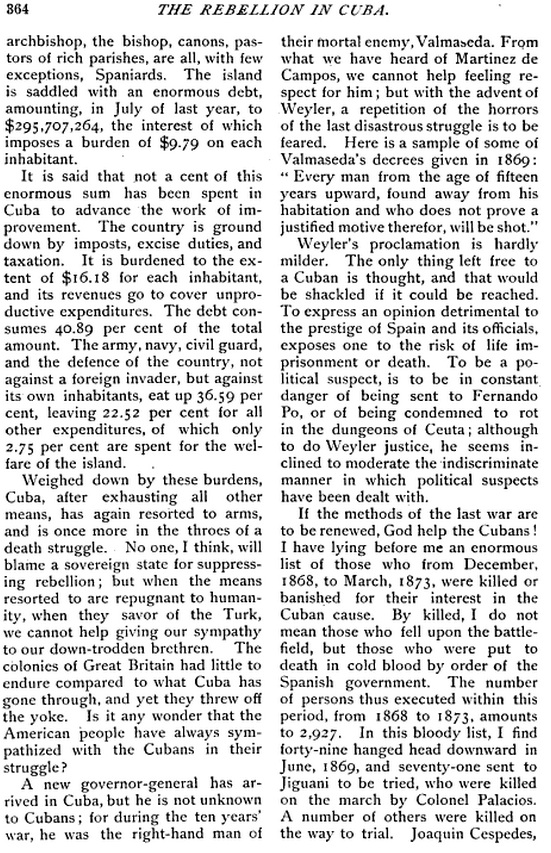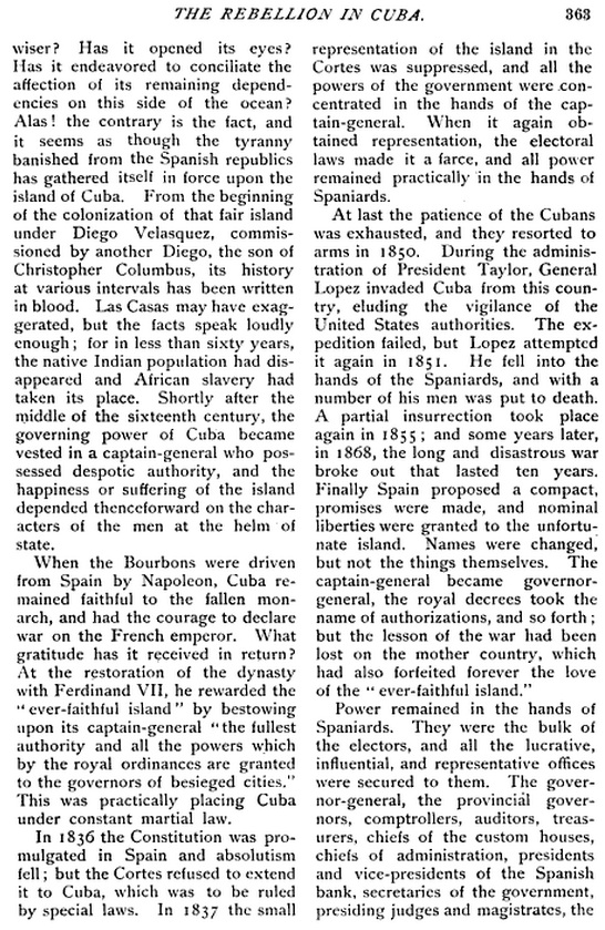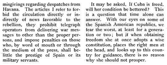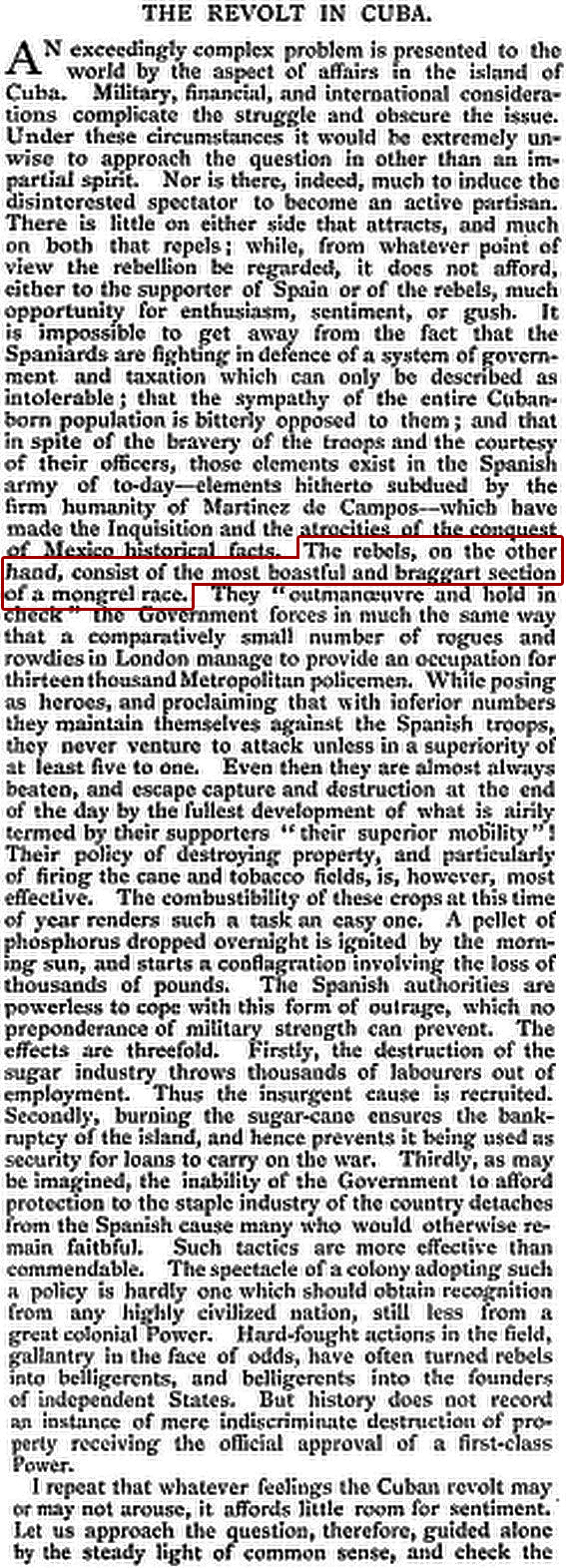 …In this revolution, the negro element has the most important part. Not only the principal leaders are colored men, but at least eight-tenths of their supporters. The black population of the Island forms a little more than one-third of the 1,600,000 Cubans, but they are strong and numerous in the Eastern part, and the result of the war, if the Island can be declared independent, will be a secession of the black element and a black Republic on the part of the island. The principal feature of the Revolution is a racial war.