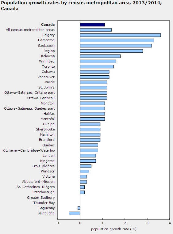 It was followed by the CMAs of Edmonton (+3.3%), Saskatoon (+3.2%) and Regina (+2.8%). Kelowna (+1.8%), Winnipeg (+1.6%) and Toronto (+1.5%) were the only other CMAs in the country to post population growth rates higher than the national CMA average rate (+1.4%). In contrast, Saint John (-0.5%), New Brunswick, was the lone CMA in Canada to see its population decline significantly.