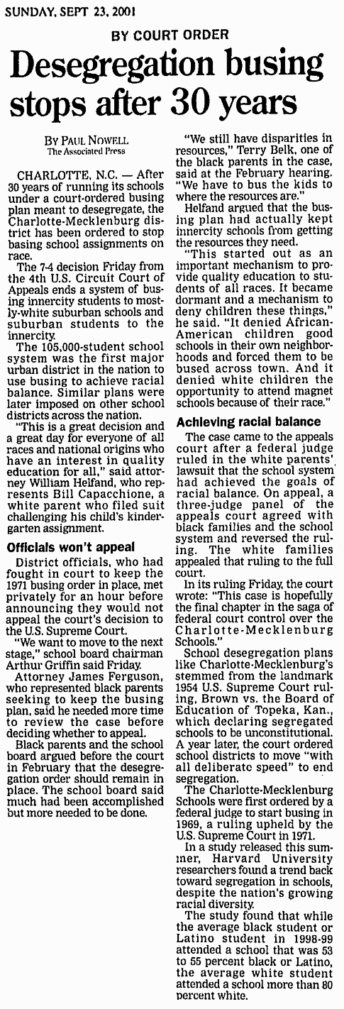 At the same time, Charlotte-Mecklenburg Schools, the state’s second-largest school district, discontinued its race-based busing program and implemented a policy that combined parental choice with neighborhood school assignment. It was a sea change for the district that had been at the center of a 1971 U.S. Supreme Court decision that led to the widespread adoption of forced busing in the South.