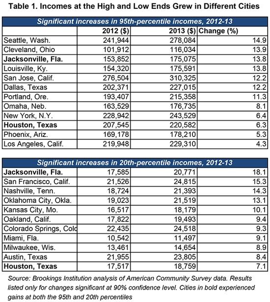Several cities witnessed dramatic growth in the incomes of their highest-earning households between 2012 and 2013 (Table 1). In 12 cities, incomes for the 95th percentile of households in 2013 exceeded those in 2012 by a statistically significant margin. Seattle topped the list with 15 percent growth in income among those households, equivalent to a $36,000 increase. The three cities with the next-largest increases at the 95th percentile—Cleveland, Jacksonville, Fla., and Louisville, Ky.—are not generally regarded as wealthy cities, and indeed the 14 percent increases they registered near the top translated to lower increases in absolute dollar terms ($21,000 in Jacksonville and Louisville; $14,000 in Cleveland). Incomes for wealthy households also jumped by double-digit rates in San Jose, Calif., Dallas, and Portland, Ore.