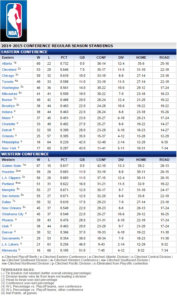 The NBA regular season ended on April 15, 2015. The playoffs begin on April 18, 2015.