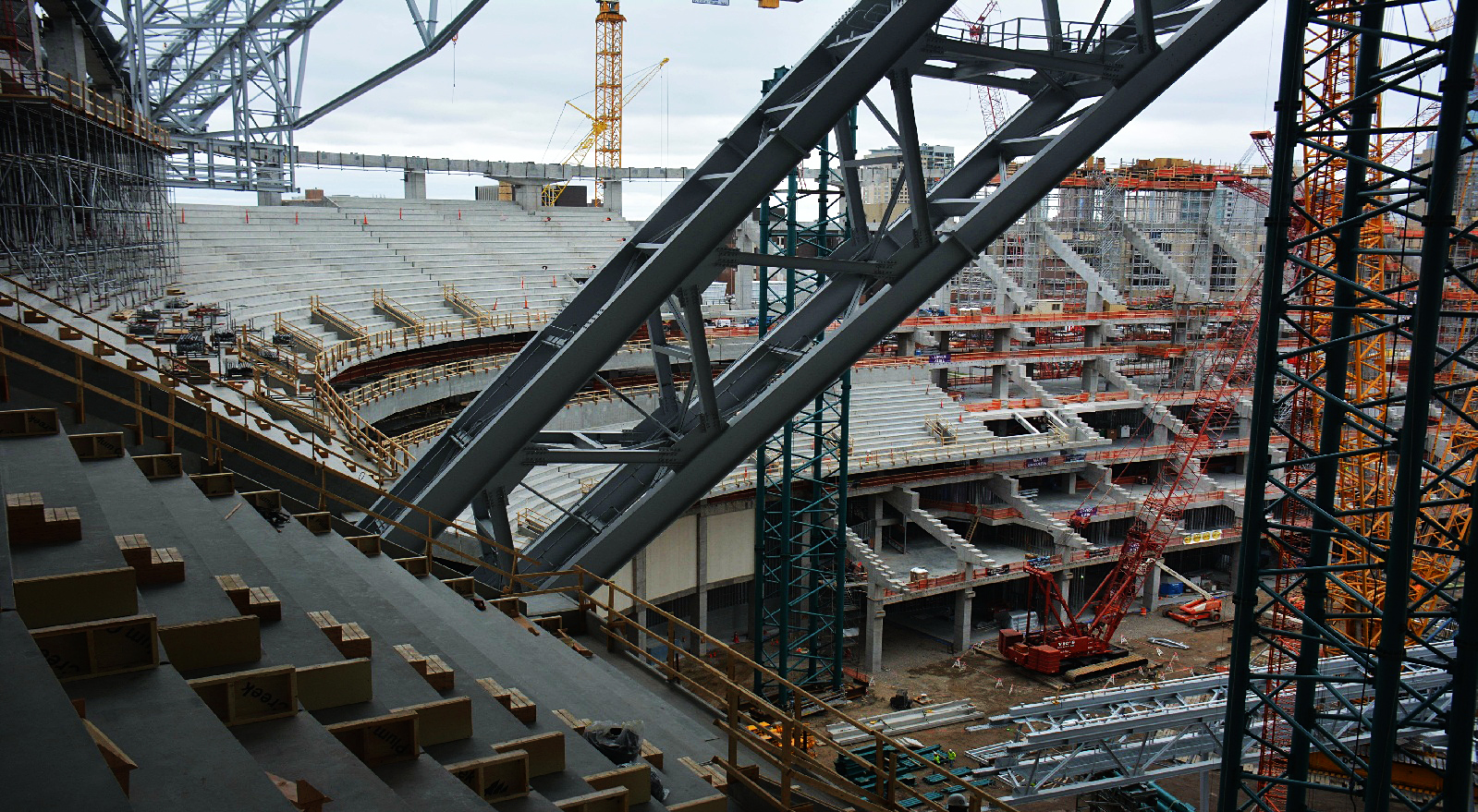 The new Vikings stadium construction is now at its halfway point. Construction officials say the project is on schedule and due to be completed by July 29, 2016. It got its official start in early December 2013.