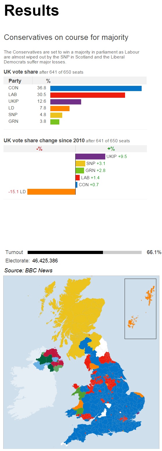 The BBC forecast, with 635 of 650 seats declared, is Conservative 331, Labour 232, the Lib Dems 8, the SNP 56, Plaid Cymru 3, UKIP 1, the Greens 1 and others 19.