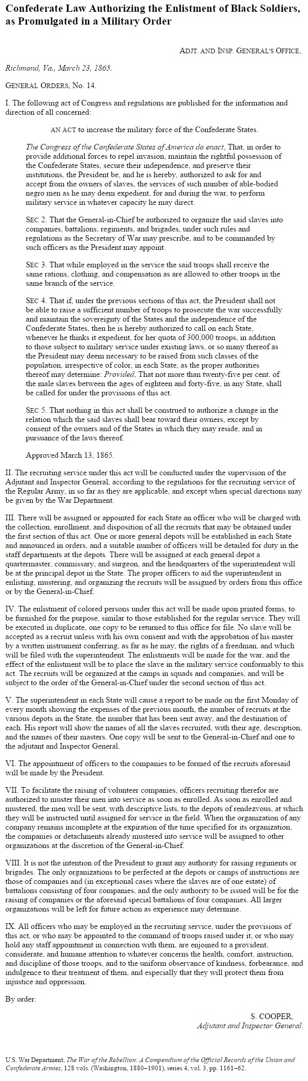On March 13, 1865, with the main Confederate States of America armies facing long odds against must larger United States of America armies, the Confederacy, in a desperate measure,reluctantly approves the use of black troops.