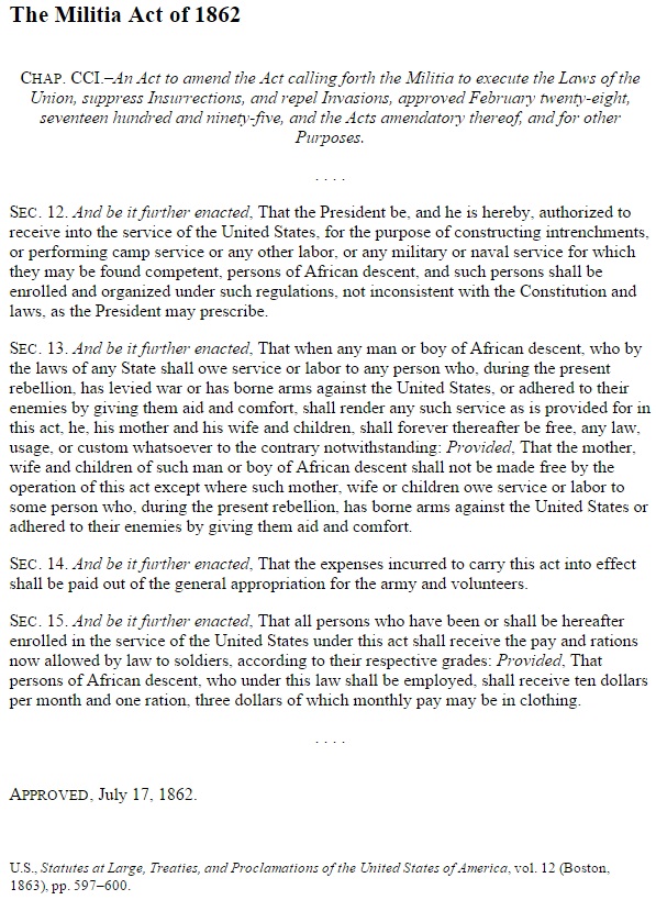 When Gen. John C. Frémont in Missouri and Gen. David Hunte in South Carolina issued proclamations that emancipated enslaved Africans in their military regions and permitted them to enlist, their superiors sternly revoked their orders. By mid-1862, however, the escalating number of former enslaved people of African descent (contrabands), the declining number of white volunteers, and the increasingly pressing personnel needs of the Union Army pushed the United States of America government into reconsidering the ban.
