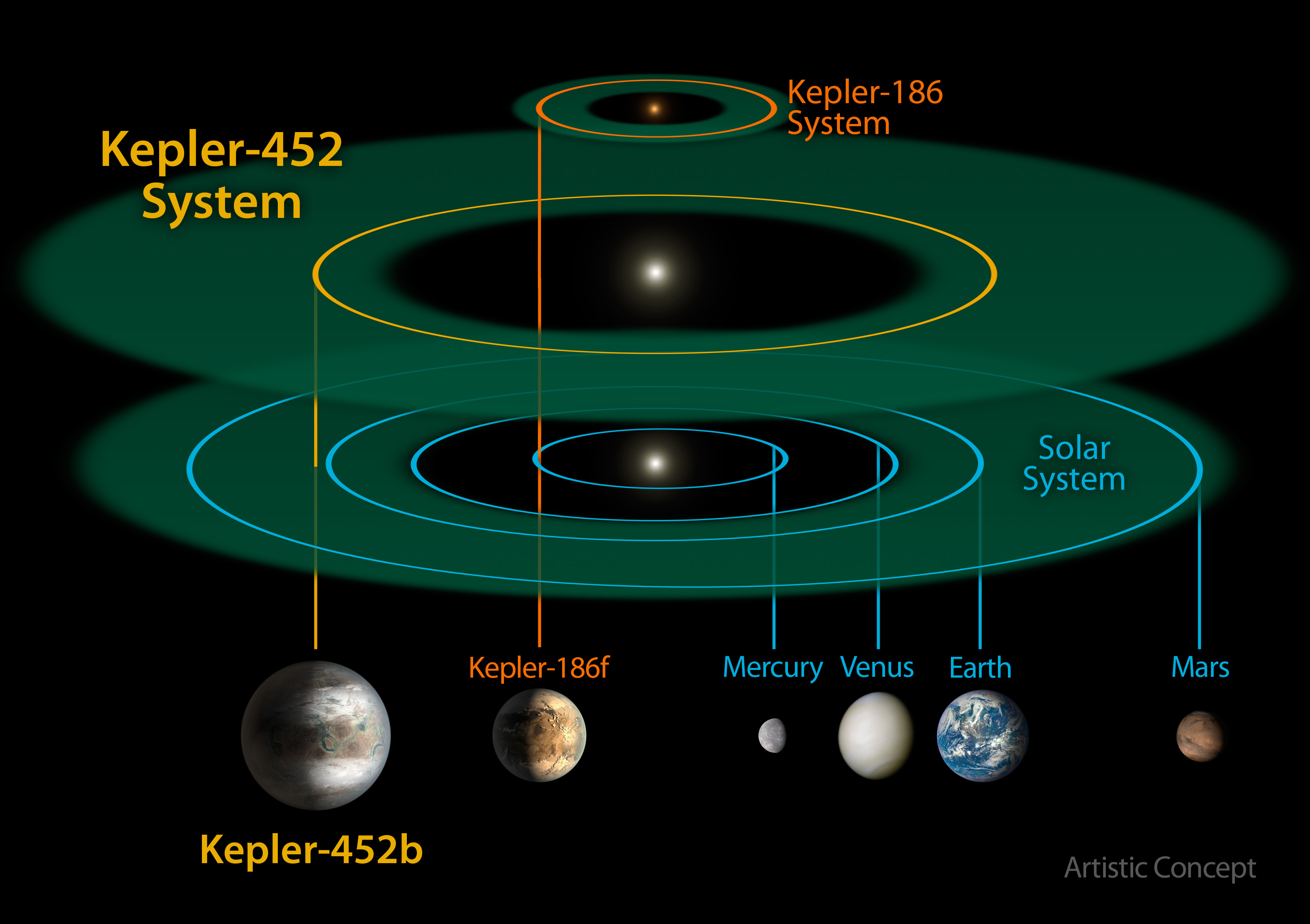 This size and scale of the Kepler-452 system compared alongside the Kepler-186 system and the solar system. Kepler-186 is a miniature solar system that would fit entirely inside the orbit of Mercury.