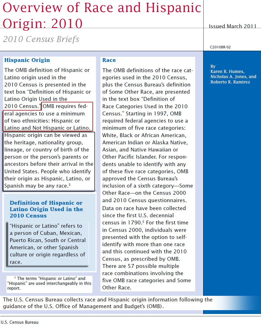 Hispanic or Latino is one of two (2) required ethnicities on the U.S. Census form by the Office of Management and Budget (OMB). The OMB is the largest office within the Executive Office of the President of the United States. The OMB requires federal agencies to use a minimum of two ethnicities: “Hispanic or Latino” and “Not Hispanic or Latino”.