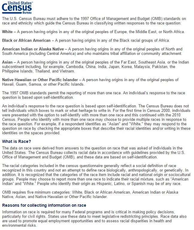 An individual’s response to the race question, on the U.S. Census form, is based upon self-identification. The U.S. Census Bureau does not tell individuals which boxes to mark or what heritage to write in on their Census forms. But, they must mark either: “Hispanic or Latino” and “Not Hispanic or Latino”. They also must also mark their race as shown below:
